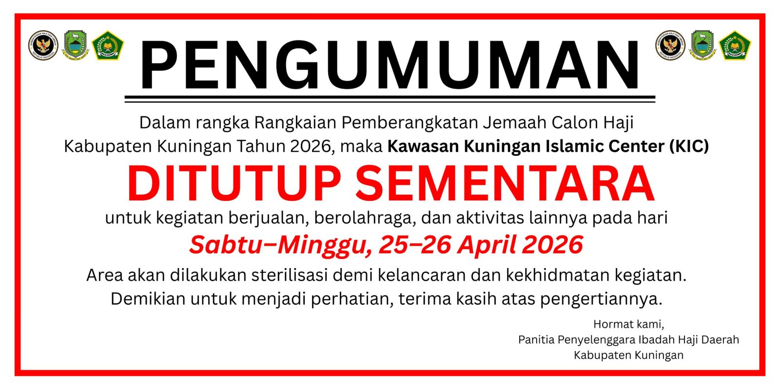 Sebagai bagian dari persiapan, Pemerintah Kabupaten Kuningan menetapkan sterilisasi kawasan Kuningan Islamic Center (KIC) yang akan menjadi pusat pemberangkatan jemaah. Penutupan sementara diberlakukan pada Sabtu–Minggu, 25–26 April 2026, mencakup seluruh aktivitas masyarakat seperti berjualan, olahraga, hingga kegiatan umum lainnya.