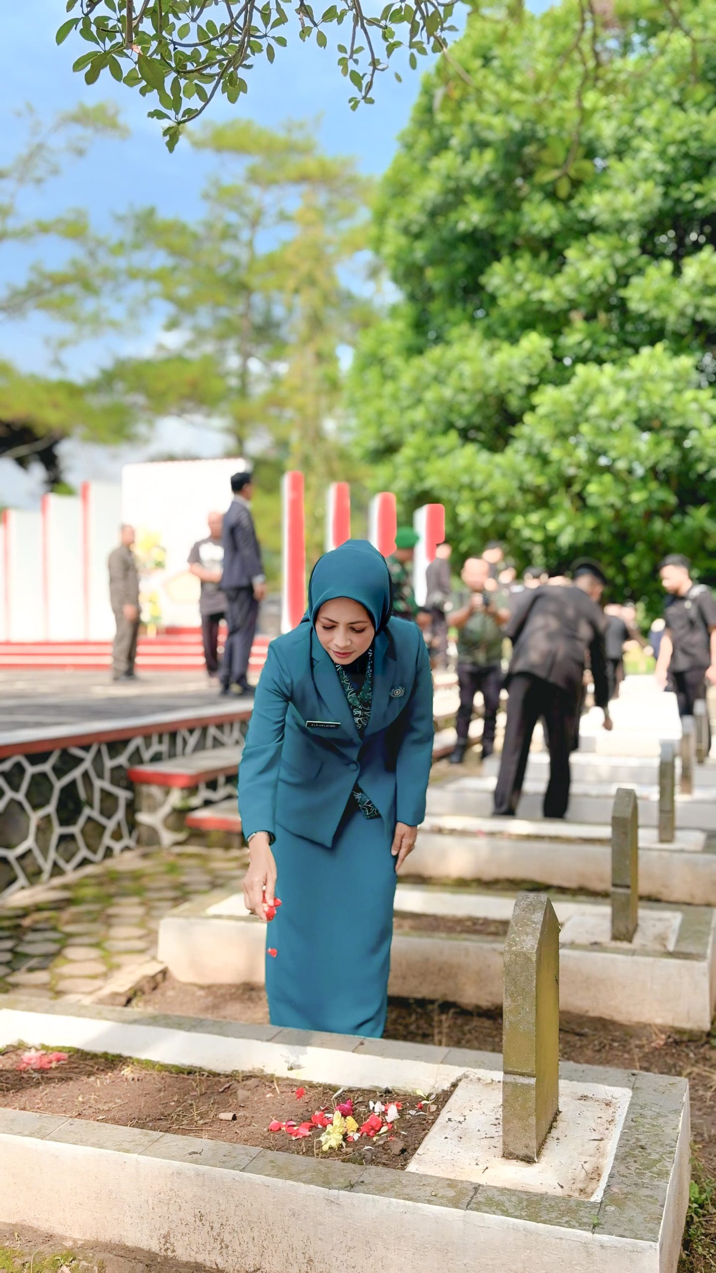 Mengenakan busana serba biru yang anggun, Bunda Ela dengan penuh hormat menundukkan kepala dan menaburkan bunga di atas pusara para pejuang yang telah gugur membela tanah air.