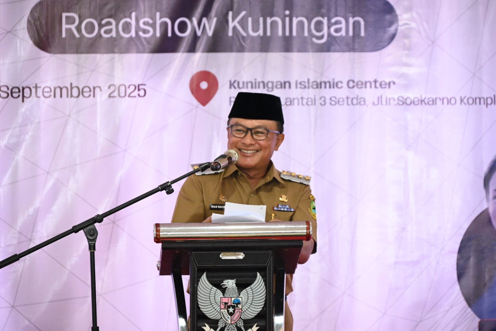 Acara ini dihadiri Staf Khusus Presiden RI Bidang UMKM dan Teknologi Digital, Tiar Karbala SMn, MSc., Wakil Bupati Kuningan Hj. Tuti Andriani, SH., M.Kn., unsur Forkopimda, Kepala OPD, serta para pelaku UMKM dan masyarakat.